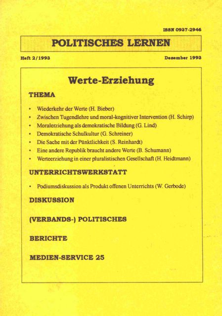 Lind, G. (1993). Moralerziehung als demokratische Bildung. [Moral education as democratic formation]. Politisches Lernen 2/1993, pp. 20-26.