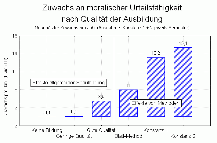 Als Beispiel für einen Fragebogen-Satz (Basis- und Schlussbefragung) zur Selbstevaluation finden Sie im Internet die Fragebogen, die ich in meinen Lehrveranstaltungen verwendet habe: Der Beispielfragebogen für die beiden Evaluationserhebungen beinhaltet als gemeinsamen Teil einen Test zur moralischen Urteils- und Diskursfähigkeit, einem zentralen überfachlichen Lernziel universitärer Bildung. Lehre und Studium sollen, wie das Hochschulrahmengesetz von 1999 feststellt, "den Studenten auf ein berufliches Tätigkeitsfeld vorbereiten und ihm die dafür erforderlichen fachlichen Kenntnisse, Fähigkeiten und Methoden dem jeweiligen Studiengang entsprechend so vermitteln, daß er zu wissenschaftlicher oder künstlerischer Arbeit und zu verantwortlichem Handeln in einem freiheitlichen, demokratischen und sozialen Rechtsstaat befähigt wird." (HRG, § 7; siehe auch Bargel & Framhein, 1976; Bargel et al., 1982). Aber tun sie das auch? Der "Moralisches Urteil-Test" (MUT) wurde 1976 in Konstanz im Sonderforschungsbereich 23 "Bildungsforschung" entwickelt (Lind, 1978; 2008) und in einer international vergleichenden Längsschnittstudie zur Analyse der Wirksamkeit fünf nationaler Bildungssysteme eingesetzt (siehe Lind, 1986). Er wurde inzwischen in dreißig Sprachen übersetzt und weltweit bei über 250.000 Studierenden und SchülerInnen eingesetzt, in Deutschland, Kolumbien und Mexiko als zentrales Maß für die Wirksamkeit des Bildungssystems. ... mehr Der MUT enthält zwei Dilemmageschichten mit Pro- und Contra-Argumenten, die nach ihrer Akzeptabilität zu beurteilen sind. Anhand der Urteilsmuster kann festgestellt werden, in welchem Maß die Studierenden sich bei ihren Urteilen konsequent an (eigenen) moralischen Maßstäben orientieren statt daran, ob die zu beurteilenden Argumente für oder gegen ihre Haltung in einer Kontroverse spricht. Der C-Index für moralische Urteilsfähigkeit lässt sich nicht simulieren, ist aber sensitiv für die Wirkung begünstigender Lernumwelten (Lind, 2002). Unter günstigen Voraussetzungen können in einer einsemestrigen Lehrveranstaltung relative Effektstärken von r = .60 und höher erreicht werden (auf einer Skala von 0.00 bis 1.00). Verschiedene absolute Effektstärken sind unten in der Graphik abgetragen (geschätzt auf Grund zahlreicher Studien bzw. direkte Ergebnisse aus Studien mit dem MUT; maximal möglicher Zuwachs = 100 auf einer skala von 0 bis 100; zu den Schätzungen siehe Lind, 2002).