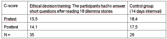“The results do not speak for a efficacy of Ethical Decision Training, because no significant changes of moral judgment competence and attitudes toward doping could be found, with the exception of the PEAS scores in the ET. This speaks for a worthening of doping attitudes as a consequence of the training intervention. ... One would have to conceptualize and evaluate another, more effective alternative.” (p. 82; translation – GL).