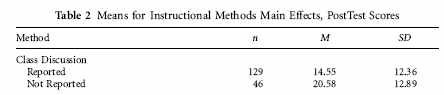 Table 2 indicates, posttest scores were significantly higher when class discussion was