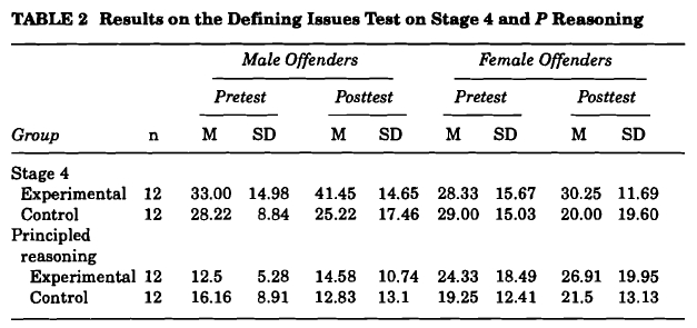Their dilemma method stimulated a gain of moral judgment competence (as measured with Kohlberg's Moral Judgment Interview, MJI) by roughly one half Kohlbergian Stage, as compared to no change in the control group (see their Table 2 below).