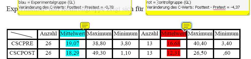 Second group ("RML"): Pretest C = 15,0; posttest C = 17,6; absolut effect size: + 2,6 C-points (N = 125)